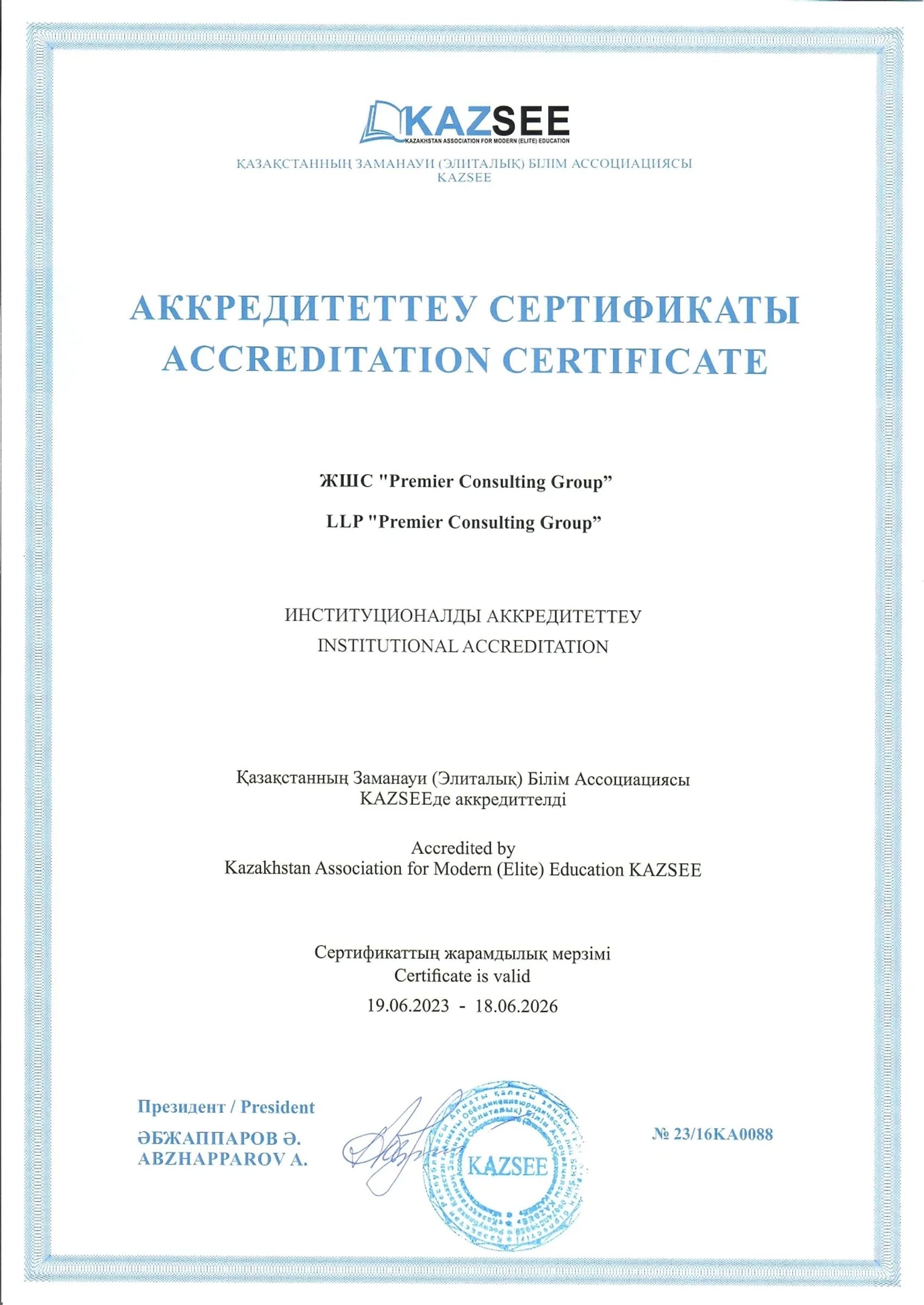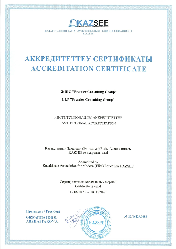 Premier Consulting Group аккредитована Казахстанскои Ассоциациеи Современного (Элитного) Образования KAZSEE.